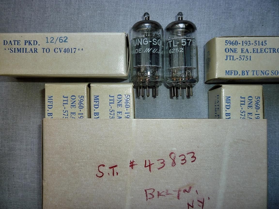 JTL-5751 (12ax7) TUNG-SOL, посдедняя одна штука, отобрана для амии США, серые аноды, О getter 62-й год в оригинальной коробке, никогда не использовалась, эмиссия 100% - 12000руб.