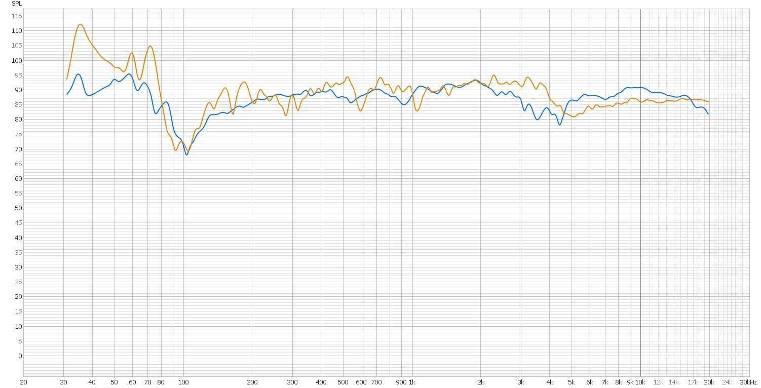 Снял АЧХ в комнате, в принципе, вроде для первого раза, без подгонки элементов фильтров (номиналы расчётные все оставил), удовлетворительно получилось. Ознакомился с реальными АЧХ в комнатах дорогих АС, многие не лучше. На НЧ - это моды, особенно на 105 герц примерно. ВЧ пришлось переполюсовать, а то провал большой был на 1400 герц. ВЧ динамики наверное поменяю всё-таки, и звук не нравится и чувствительность немного добавить можно. Синий график - около динамика, оранжевый - в точке прослушивания, сглаживание - 1/12.