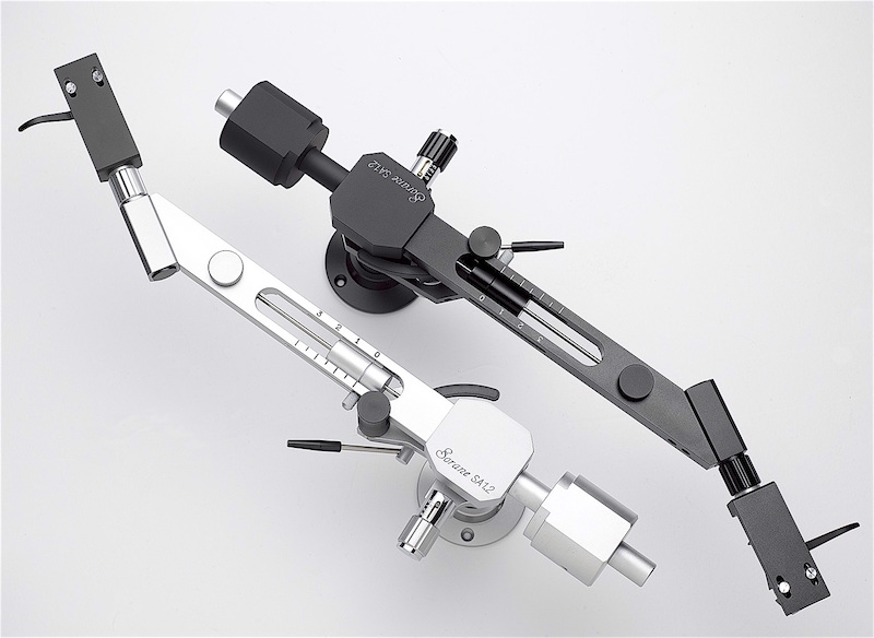 В наш салон прибыли тонармы известного японского производителя - Sorane. Популярная модель тонарма Sorane SA 1.2 доступна теперь в двух цветах. Данная модель входит в число рекомендуемых компонентов класса А журнала Stereophile и принадлежит к числу средних и тяжелых тонармов. Подвеска карданная, балансировка с помощью основного груза, установка прижимной силы с помощью второстепенного груза, расположенного в середине плеча тонарма, что обеспечивает стабильность следования по дорожке. Профиль тонарма П-образный и изготавливается из цельного уголка алюминия. Опционально, можно приобрести переходную базу для посадки SME – SSB, которая тоже доступна в двух цветах и способствуют перемещению точки фиксации в горизонтально направлении. В комплекте тонарма соединительный кабель, шелл с регулировки азимута, шаблон для установки, дополнительный груз для балансировки и прижимной силы.