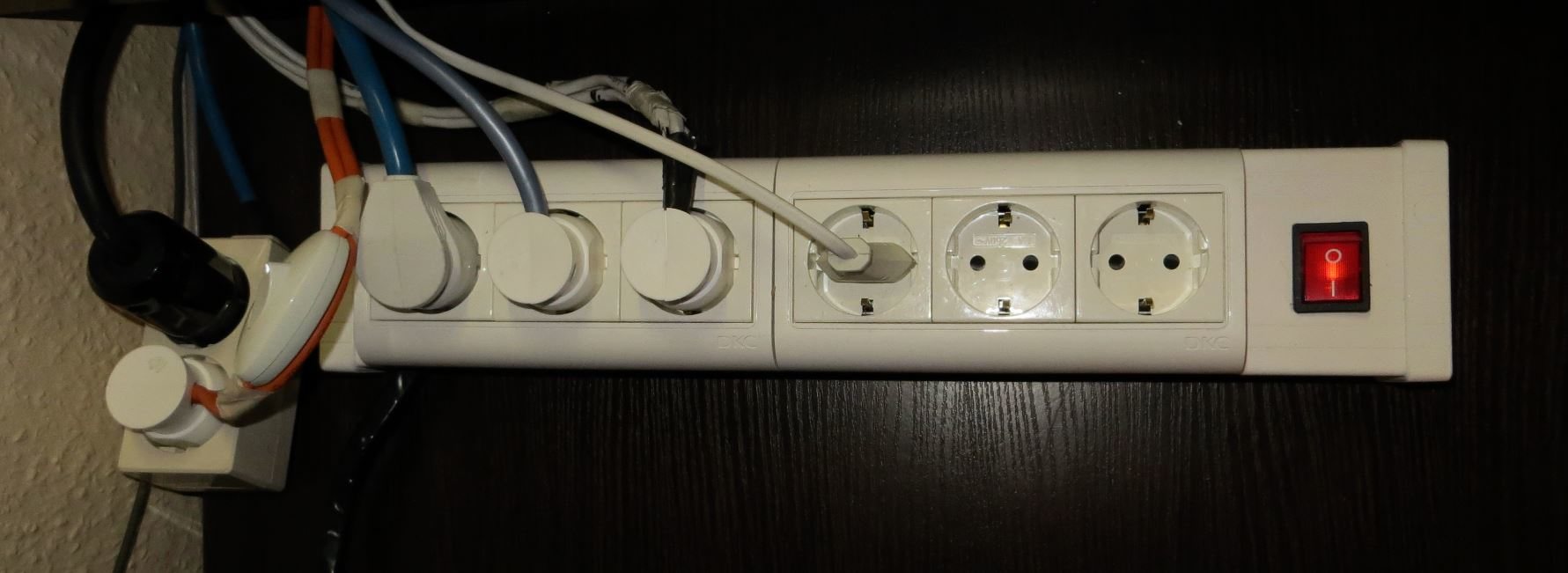 А вообще питание для настольного компьютера с аудиосистемой сделано из проводов - то, что ушло из аудио системы в связи постановкой более лучшего кабеля. Специально я кабеля не делал. Только удлинитель -распределитель собрал из немецкого короба и блока розеток DKC к нему. Вилки Legrand.