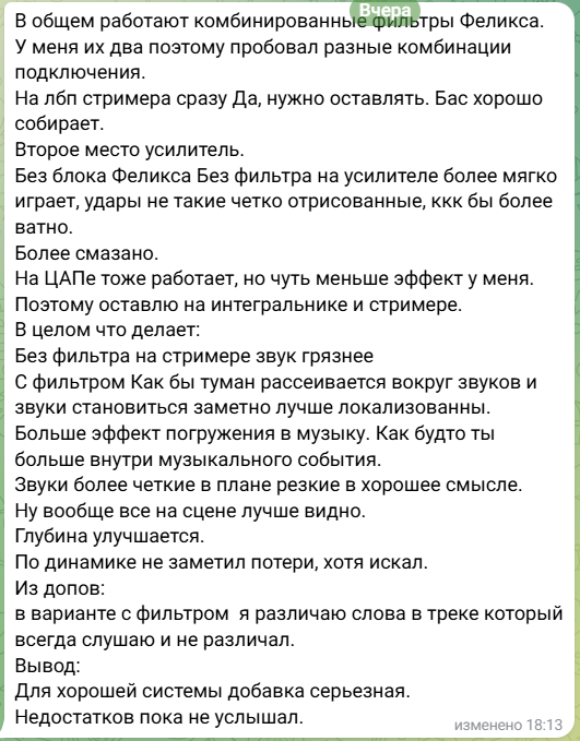 felix Posted October 5, 2025 Share Posted October 5, 2025 Проблема с "постоянкой" сейчас проявляется всё больше и больше. Поэтому, я снова изготовил DC-Blockerы, но в этот раз я сделал комбо устройство, это фильтр "постоянки" и магнитный фильтр Nothing. Мощность подключаемой нагрузки ограничена током инлета - 10 Ампер. Устройство способно работать на всю систему перед дистрибьютором питания, но лучше будет на каждый компонент, в этом случае будет ещё и взаимная фильтрация подключенных аппаратов. цена 18000 рублей. 1 Quote Link to comment Share on other sites More sharing options...